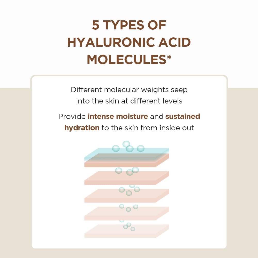 - Hyaluronic Acid: A blend of five types of Hyaluronic Acid for multi-layer hydration, locking in moisture and keeping the skin plump and supple.